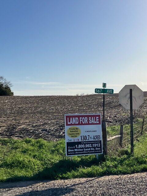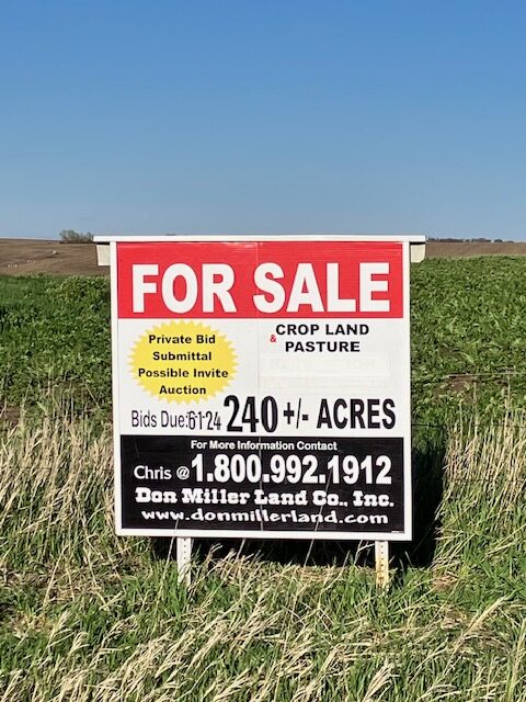 4 East 3 South of Hartington, Nebraska. Taking sealed bids at this time, bids due June 1. Bid package can be obtained by calling (402) 254-6897 or emailing millerland@hartel.net.